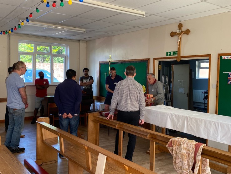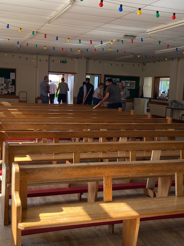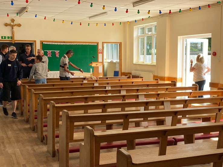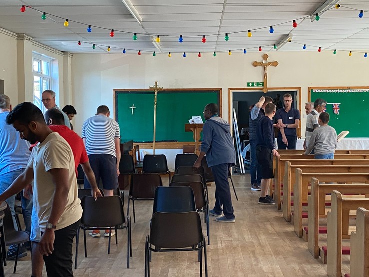 A sincere thank you to the many volunteers from across all of our Salisbury churches that turned up on bank holiday Monday morning to move the contents of St Gregory’s church, and presbytery into the hall to allow full decoration of the church to occur during the month of June. Because we were blessed with so much support from women, men and children, a difficult job was made much easier and thanks to the organisation of a Tony Coyle and Jez Mawdsley, the work was completed in just three hours. What a wonderful team effort and a sense of our Catholic community that  so many people were prepared to give up their bank holiday Monday to do this. The constant stream of tea, coffee and biscuits ensured that nobody went thirsty. For the month of June, Friday and Sunday Mass will be held in the hall before we need to repeat the whole operation in reverse when work is complete.